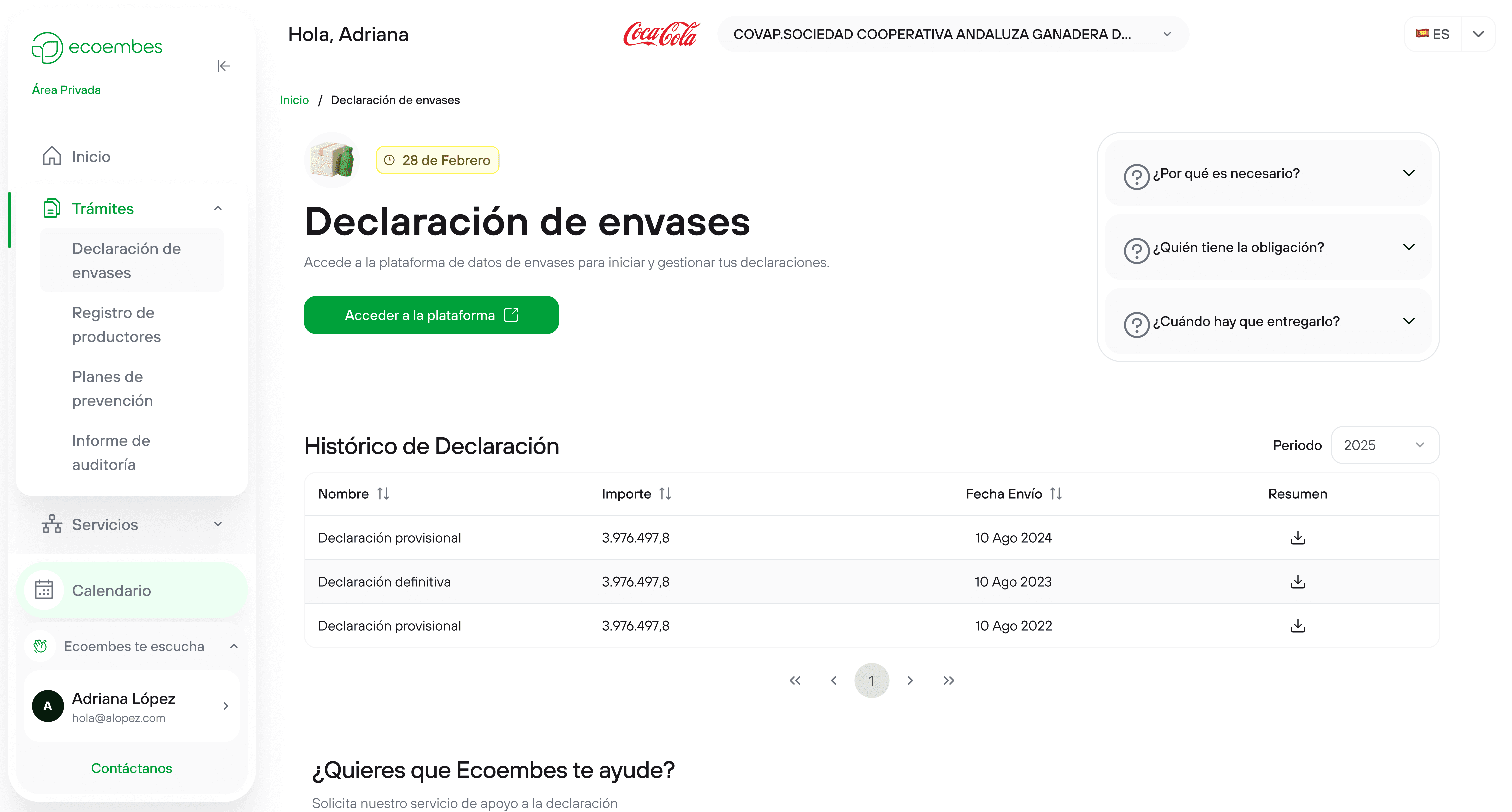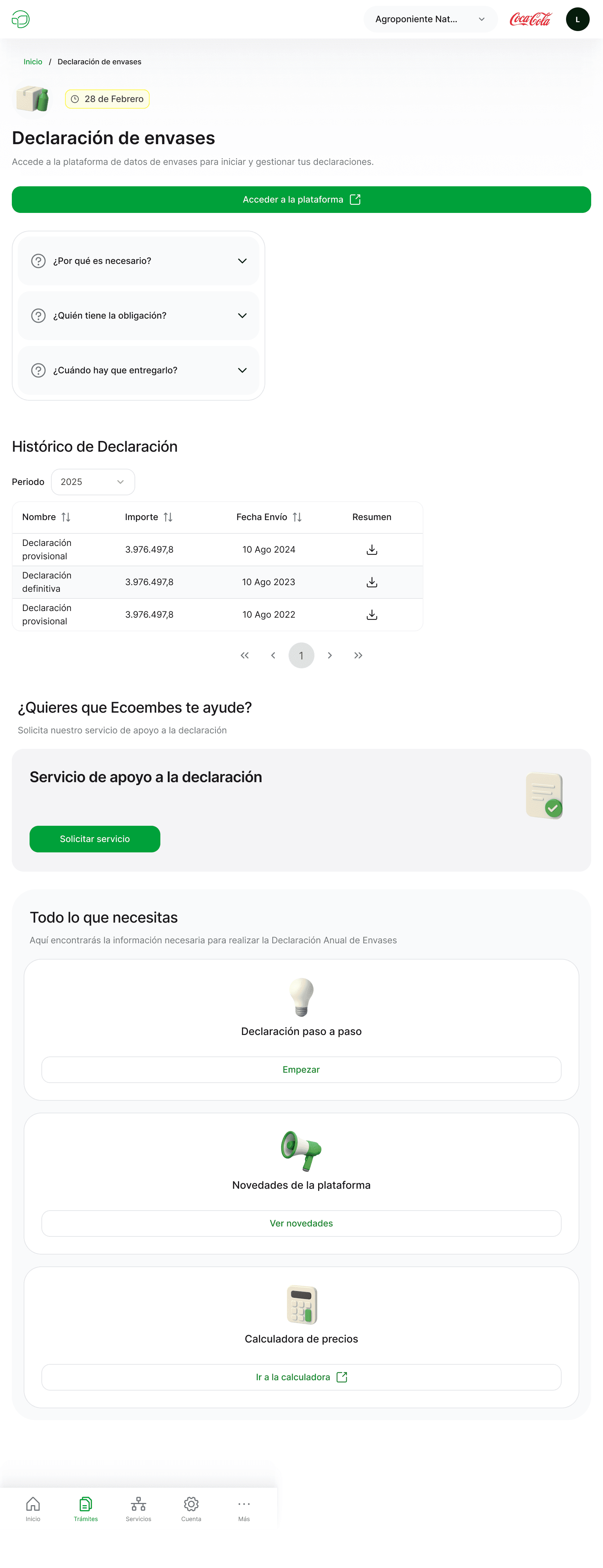 "El botón para ir a la plataforma está ahí, pero a veces necesito consultar lo que hice el año pasado. Me gustaría tener el histórico de declaraciones anteriores accesible en la misma pantalla, para comparar datos fácilmente."